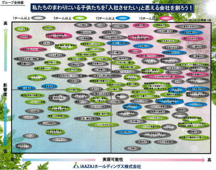 50年後、100年後も会社を継続していくため、社員がそれぞれに思ういい会社の意見を出し合って「みんなの思ういい会社」マップを作成してます。
