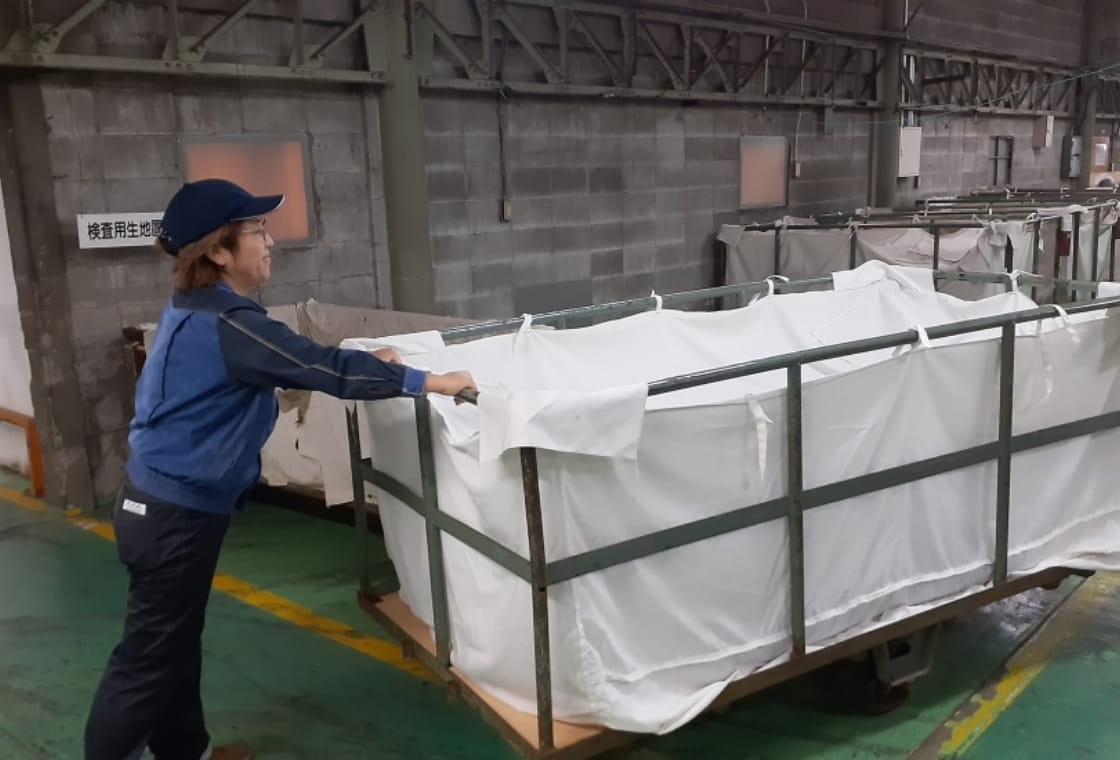 入社して5年間は製品を目視検査する工程で働いていましたが、その経験を活かす形で段取り担当者になってからは、工場全体でどのような流れで生地が製品になっていくのか知ることが出来て、とても面白く感じています。また、良い製品が納期に間に合い、出荷されていくのを見る時にやりがいをとても感じます。工場内で働く皆で、良いものを作ろうと努力していく姿がとても良いと感じています。
